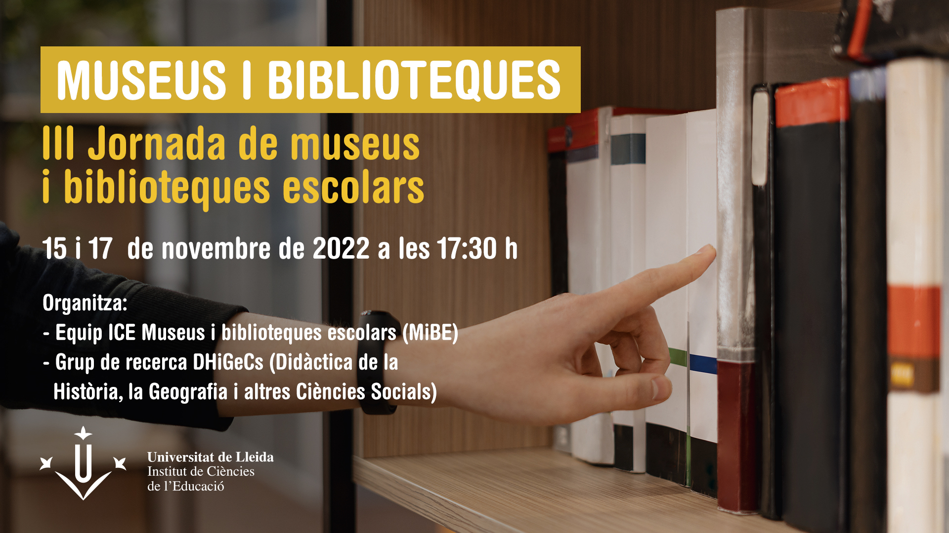Des de l’Institut de Ciències de l’Educació de la UdL, l'equip ICE de Museus i biblioteques escolars (MiBE) us convida a la seva tercera jornada formativa, que té com a finalitat, d’una banda, donar a conèixer la tasca desenvolupada per les membres del grup durant el curs 2021-2022 i, per l’altra, realitzar una formació sobre laboratoris de lectura i l'ús d'objectes dins d'aquests.