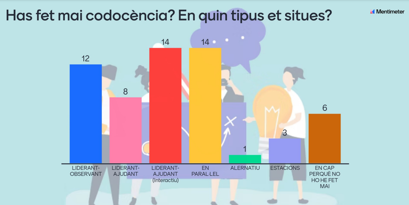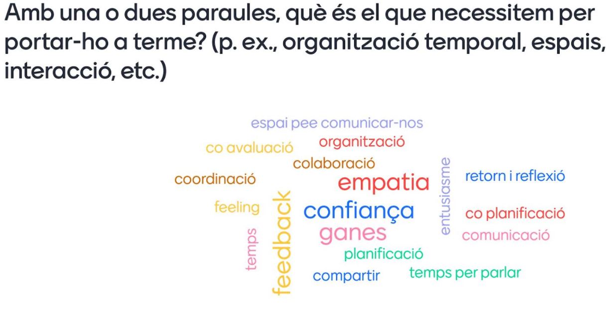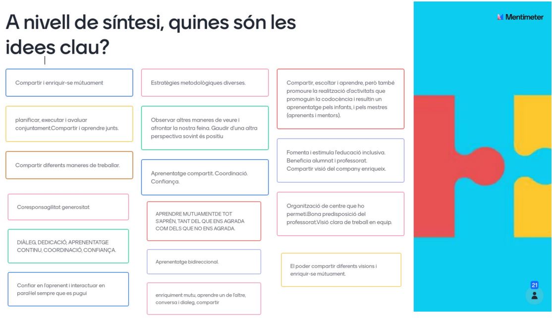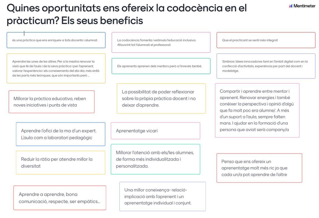 La segona part, distribuïts en diferents sales virtuals es va realitzar una dinàmica de treball on es va reflexionar i conversar conjuntament -mentors/es, tutors/es i aprenents/es - en relació al pràcticum i la codocència i a partir de diferents preguntes.